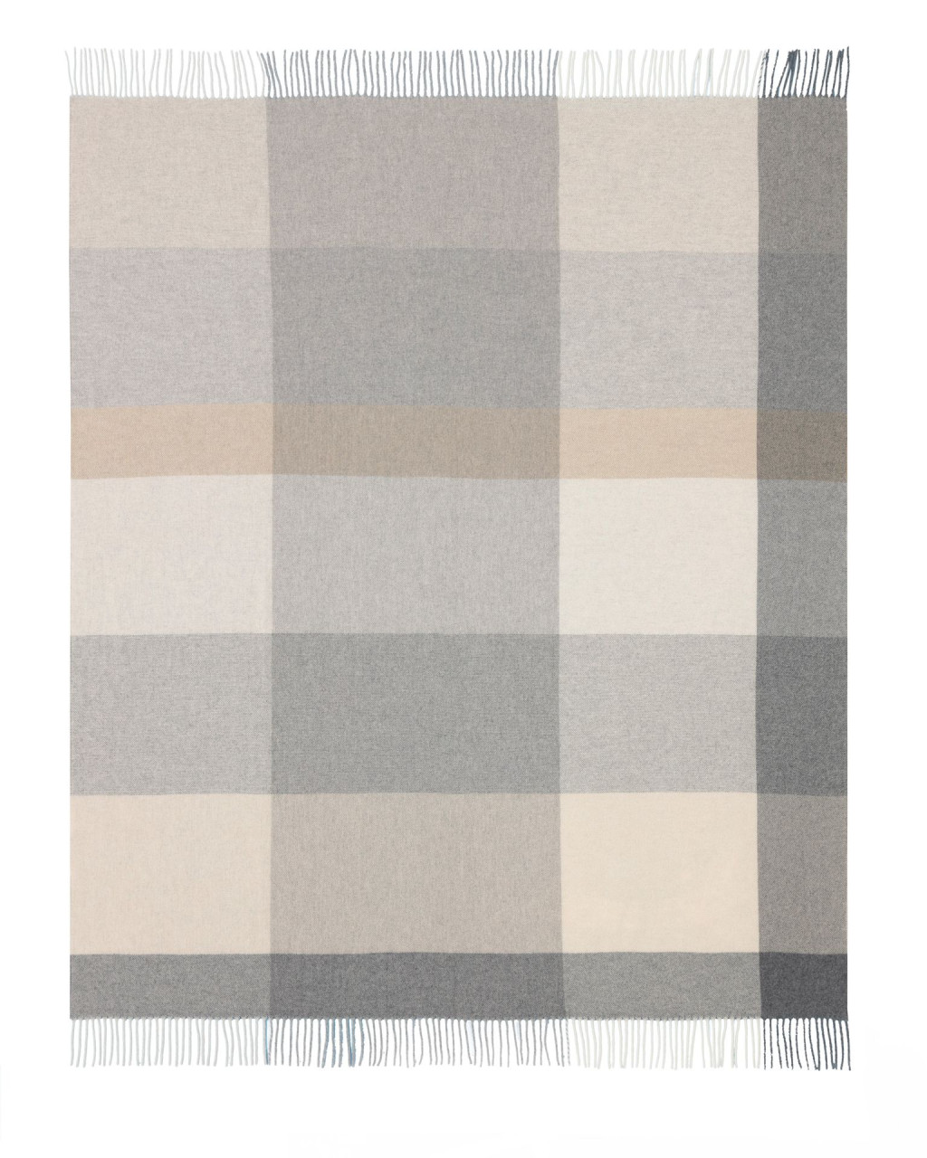 Luxus kasmír takaró, amely finom gyapjú és kasmír keverékéből készült, rojtos szegéllyel ellátott, világos kockás mintával.