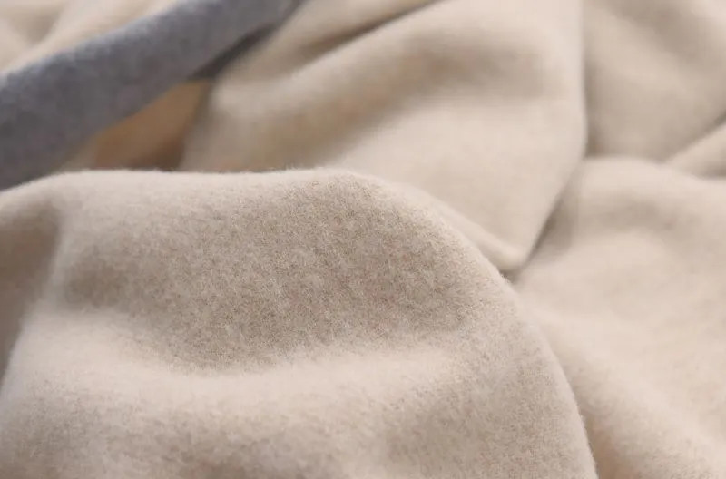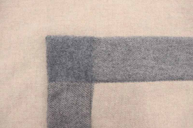 Luxus takaró, amely finom 100 % gyapjúból készült drapp színben, szélén szürke széles gyapjú szegéllyel ellátott.